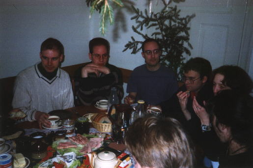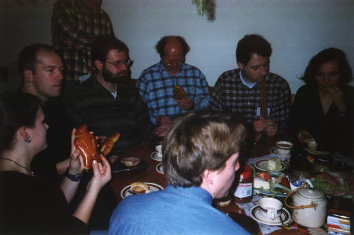 Bluwu, Silke, Taxi, Svenman, Mo und Olli beim Frühstücken